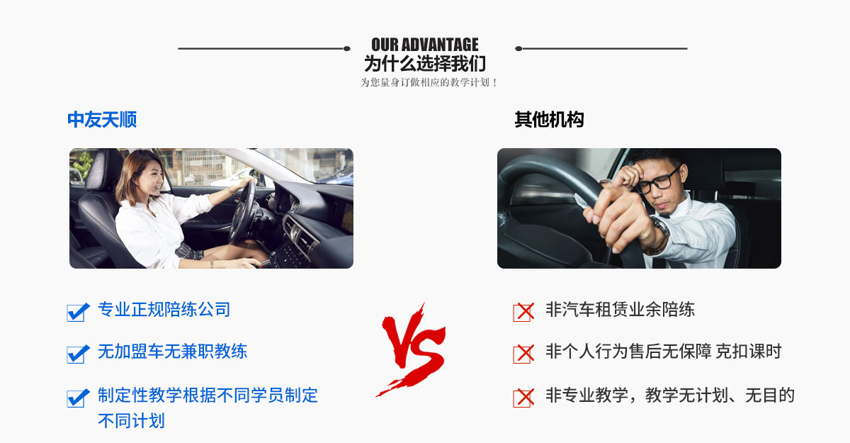 北京中友天順汽車陪練隸屬于北京中友天順汽車技術有限公司一家專業(yè)的汽車陪練公司,公司秉承宗旨:為已有駕駛本而不能夠在實際道路上安全行駛的駕駛員而服務的,我們大力宣揚道路安全駕駛理念,深度提高駕駛員駕駛技術,為首都駕駛員的安全駕駛技術和安全駕駛意識服務.從而減少首都道路的涌堵,減少首都交通事故的發(fā)生。針對不同開車基礎的學員制定各種培訓方案!誠信、專業(yè)、周到!北京中友天順汽車陪練公司全部為部隊轉業(yè)軍人,駕齡都在十五年以上,